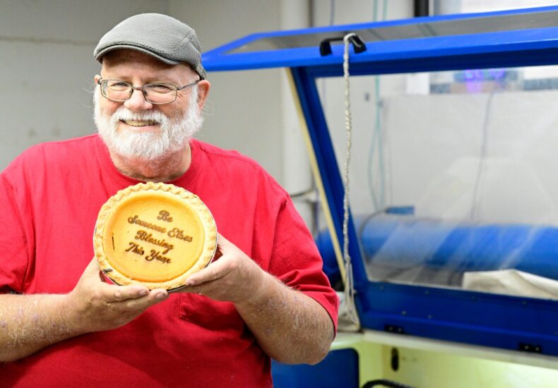 Elza Simpson was always interested in technology. He would cook up plans and designs from a young age, and his father would provide the parts to make them a reality. He spent his career working in web design, but after he retired, he cast about for a new hobby to scratch his intellectual itch. He found it at Loveland CreatorSpace, making Christmas ornaments, wall decorations and all manner of other knickknacks with a laser engraver a piece of machinery that burns or cuts into materials like wood, stainless steel, and around this time of year, pumpkin pie. Simpson has been burning images and messages into fully edible pumpkin pies that he shares with family and friends, as well as a handful for organizations like the Loveland Police Department and Loveland Fire Rescue Authority for a few years, ever since he discovered the concept while browsing the internet for more ideas on how to use CreatorSpace’s laser engraver. We caught up with Simpson about his hobby and what fascinates him so much about lasers. 1. How did you first start doing this? Well, a couple years ago I was searching the internet. Looking for ideas and stuff. And I came across somebody laser engraving pies and thought “Well, I’m going to try that.” I started out with little ones, and they came out okay, so I tried bigger ones, making them for family and friends, and then a chaplain with the police department wanted one so I made one for him. This year they ordered seven, the police department and the fire department, so I’ll be doing some for them. 2. Have you always been a crafty kind of guy? Well I was always designing stuff. Growing up it was all electronics, designing electronics and stuff. And then once I retired, I was looking for something to do. We moved to Loveland, found CreatorSpace and I took their laser engraving class. It just blossomed from there. Now on my Etsy shop I sell a lot of Christmas ornaments, last year I sold about a thousand of those. 3. Talk more about the kinds of things you did growing up. What kind of things would you design? Like I said, I started out with electronics. My dad was into electronics, and he’d say “OK, design this.” And he’d buy me the parts to make it. Once of the first things he had me design, I was in the Boy Scouts with the Pinewood Derby cars and the racetrack. Well we wanted something to trigger the start of the race, time it, and figure out who got first second and third. That took me about two weeks to figure out. Nowadays its so simple. Back then it was all relays, all mechanical. 4. Is it more difficult to engrave food than other materials like wood? Figuring out the power settings is totally different than wood, the power and speed. But yeah, food is a little harder. But it’s safe to eat, because all it is, is heat. It’s just making that portion a little more well done than the rest. There’s no chemicals involved at all. 5. What kind of challenges does food introduce that wood or metal wouldn’t? It’s kind of hit or miss on how well they turn out, because you know, the consistency of the pie, whether or not they’re kind of sunk in, ones that are a little more level are better. I’ve been wanting to try chocolate, but I think if it got a little too warm and melted, they’d get upset with me. (Laughs). I’d have to put it on a pan or something, but we could figure it out.
